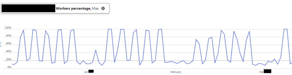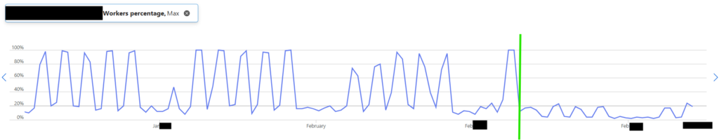 - Worker Pool Volatility: Azure Portal metrics showed a jagged, spiky pattern that frequently hit 100% worker utilization during report runs.