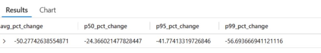 - Massive Latency Reduction: Our SQL Dependency telemetry in Application Insights showed a dramatic shift in performance across all percentiles. Our p99 dependency duration saw a staggering 56.6% improvement, while the average latency dropped by 50%.